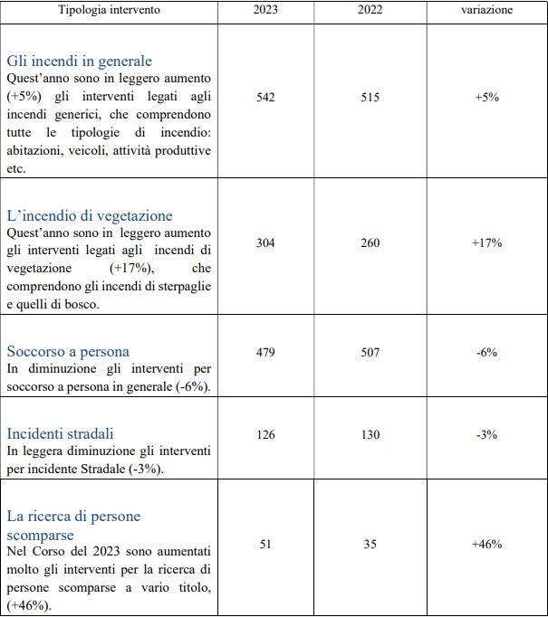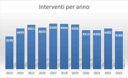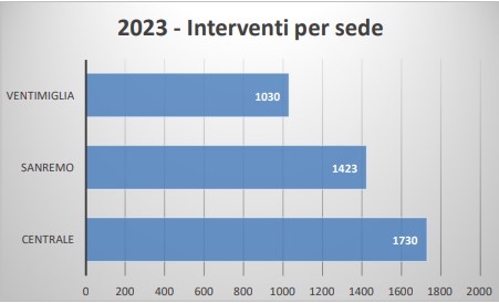 Dal 01 gennaio al 30 novembre 2023 sono stati effettuati complessivamente in Provincia di Imperia 4.183 interventi, di cui: 1730 Imperia, 1423 Sanremo e 1030 Ventimiglia. Il dato è in leggero calo rispetto all’anno precedente, confermando il trend di riduzione costante dei precedenti cinque anni. Tra gli interventi più importanti che hanno visto i VVF in primalinea nel corso del 2023, si ricordano l’incendio tra Verezzo e Ceriana dello scorso agosto e la fuga di gas a Soldano che ha sventrato una palazzina e reclamato una vita.