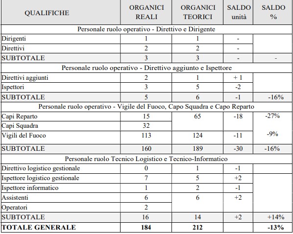 Il Comando di Imperia ha gestito complessivamente nell’anno 2023 circa n. 208 unità di personale, suddivise nella componente di ruolo, operativa e amministrativa (n. 184 unità) e volontaria (n. 24 unità discontinue a richiamo temporaneo). Rispetto all’anno precedente si registra un lieve incremento d’organico (+5%) che, al netto dei pensionamenti intervenuti, porta la carenza di organico media complessiva pari a circa il -13%, rispetto alla pianta organica teorica del Comando attualmente vigente.