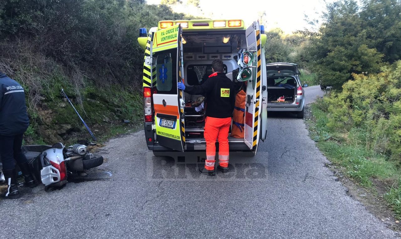 Un cinquantenne norvegese, abitante in Francia, è rimasto ferito, stamani, in via otto Case (frazione Sealza), a Ventimiglia, dopo essersi scontrato con una vettura Renault Megane, condotta da una donna e a bordo della quale viaggiavano anche due bambini, che per fortuna sono rimasti illesi. Lo scooterista ha riportato un trauma cranico e uno alla schiena, oltre a una serie di contusioni in corso di accertamento da parte dei medici. Sul posto il personale sanitario del 118, con la Croce Verde e la Polizia locale.