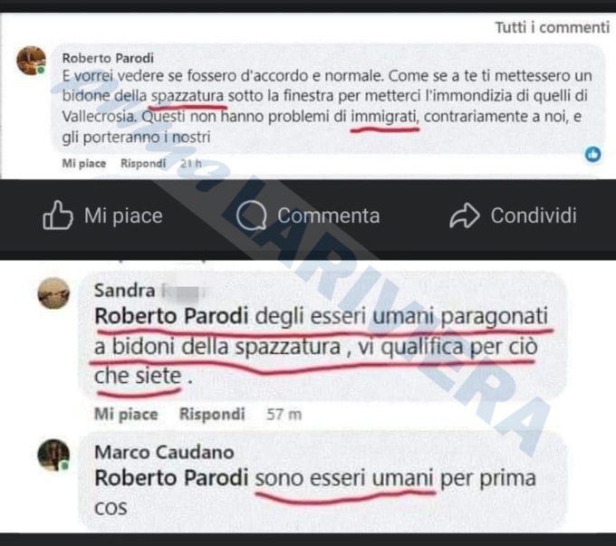 Degli essere umani paragonati a bidoni della spazzatura, vi qualifica per ciò che siete”, uno dei commenti e poi: “Sono esseri umani per prima cosa”, afferma Marco Caudano ex politico del centrosinistra.