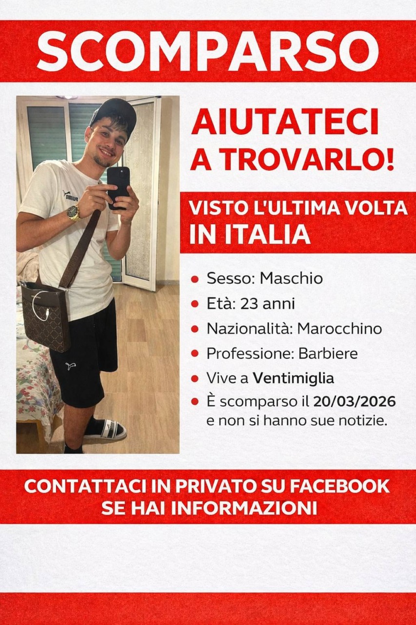 Seppure il giovane, di cui non si fa il nome, ma viene postata solo la fotografia, sia scomparso da quasi tra settimane, solo in serata è stata lanciata una richiesta di aiuto. “RAGAZZO SCOMPARSO – AIUTATECI PER FAVORE – si legge nell’appello social – Stiamo cercando urgentemente questo ragazzo. È scomparso il 20/03/2026 e da quel momento non si hanno più notizie. Vive a Ventimiglia, 23 anni, marocchino, fa il barbiere. La famiglia è distrutta e molto preoccupata. Ogni minuto è importante! Se lo avete visto o avete QUALSIASI informazione, scrivetemi subito in privato su Facebook. Condividete questo post il più possibile, anche un piccolo gesto può fare la differenza! Grazie di cuore a tutti ”