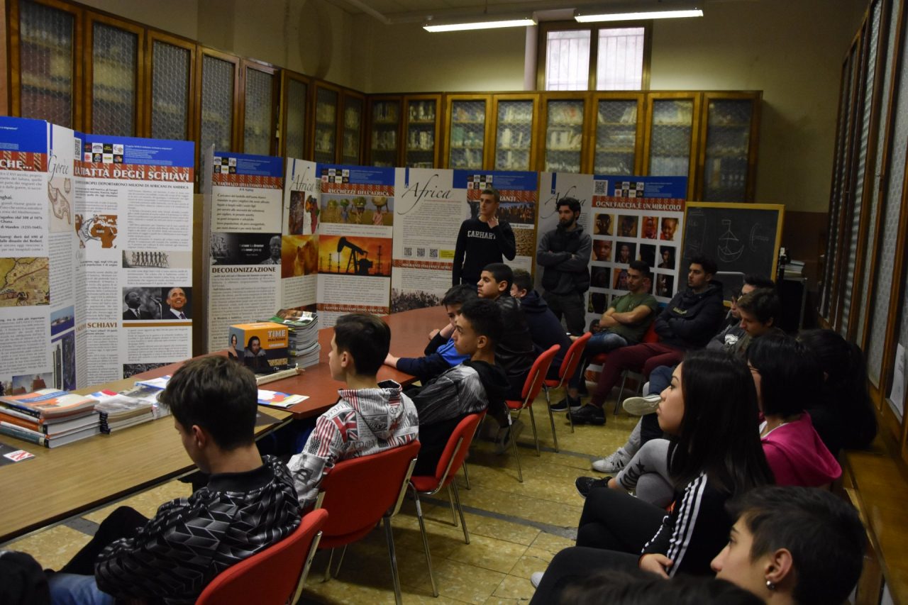 Le varie classi del “Colombo”si sono succedute per vedere la mostra e per sentire le spiegazioni dei due ospiti presenti. Si tratta quindi di Silvia Carlino, volontaria della CARITAS, coordinatrice del progetto e molto impegnata nella sensibilizzazione su questi temi, e Mbaye.