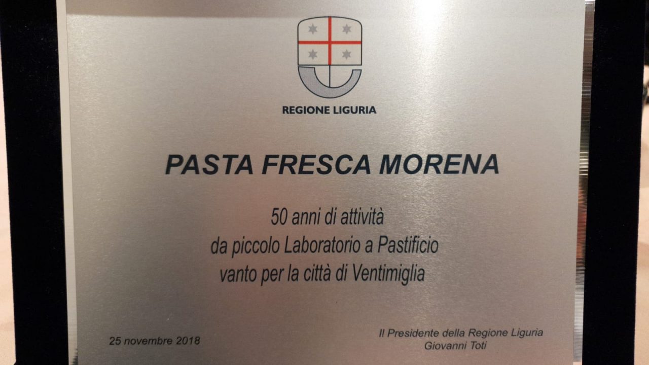 Una targa per premiare 50 gloriosi anni di attività di Pasta Fresca Morena di Ventimiglia è stata consegnata a Ramon Bruno dal vice presidente della Regione Sonia Viale.