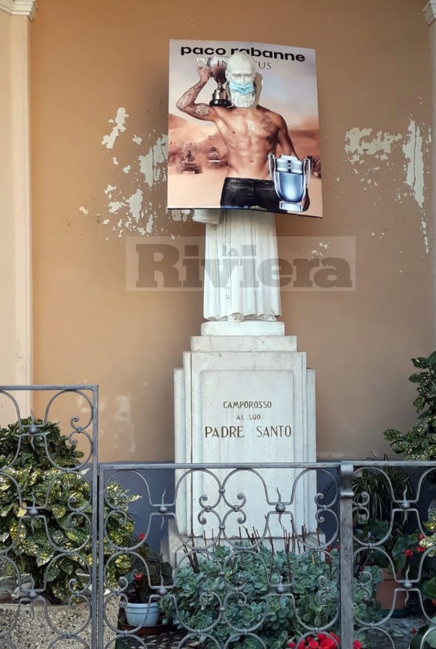 La statua del Padre Santo di Camporosso, situata nell’omonima piazza accanto alla chiesa di San Marco Evangelista, è stata vandalizzata da ignoti che hanno affisso il cartellone pubblicitario di una nota casa di profumi che ritrae il corpo palestrato di un modello. La testa della statua, invece, è stata “adornata” con la mascherina molto in voga di questi tempi. E’ caccia agli autori.