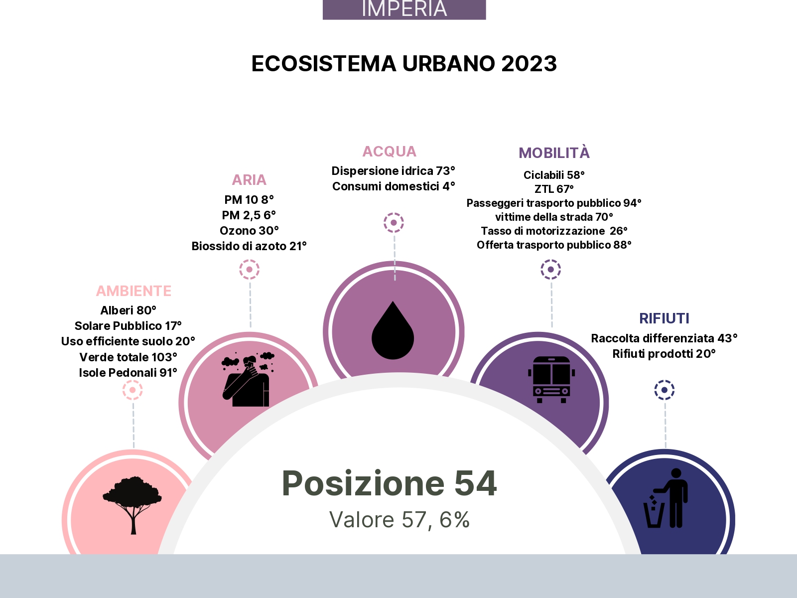 Esaminando punto per punto, nel quadro ambiente, l’Imperiese è 80° per la presenza di alberi in rapporto agli abitanti, 17° per Kilowatt erogati da impianti solari negli edifici pubblici, in 103 ª posizione per la quantità totale di verde pubblico nei centri urbani (uno dei risultati più bassi d’Italia, il peggiore per la Riviera dei Fiori). Novantunesimi per quanto riguarda i metri adibiti a isole pedonali.