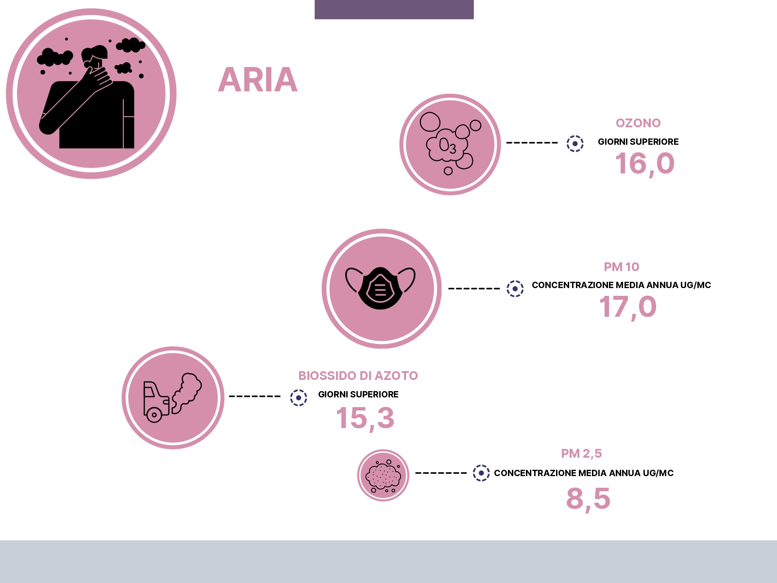 La qualità dell’aria invece registra dati tendenzialmente positivi: le così dette polveri sottili, PM 10 e PM 2,5 registrano tra i dati migliori nel Belpaese (rispettivamente 17,0 e 8,5 ug/mc all’anno, 8ª e 6ª posizione ), mentre per le quantità di ozono e biossido di azoto (prodotto, in larga parte, dai motori), la posizione in classifica è 30ª e 21ª.