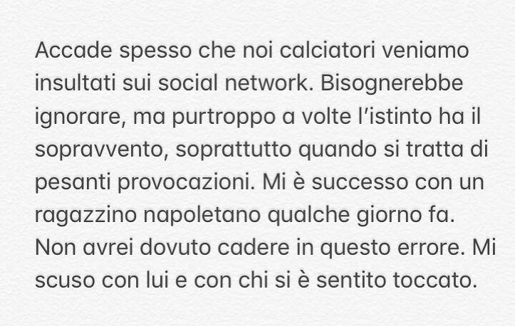 A quel punto Sturaro deve essersi reso conto di averla fatta grossa: “Spesso i calciatori vengono insultati sui social – ha scritto in un post – Bisognerebbe ignorare, ma purtroppo a volte l’istinto ha il sopravvento. Soprattutto quando si tratta di pesanti provocazioni. Mi è successo con un ragazzino napoletano qualche giorno fa. Non avrei dovuto commettere questo errore, mi scuso con lui e con chi si è sentito toccato”.