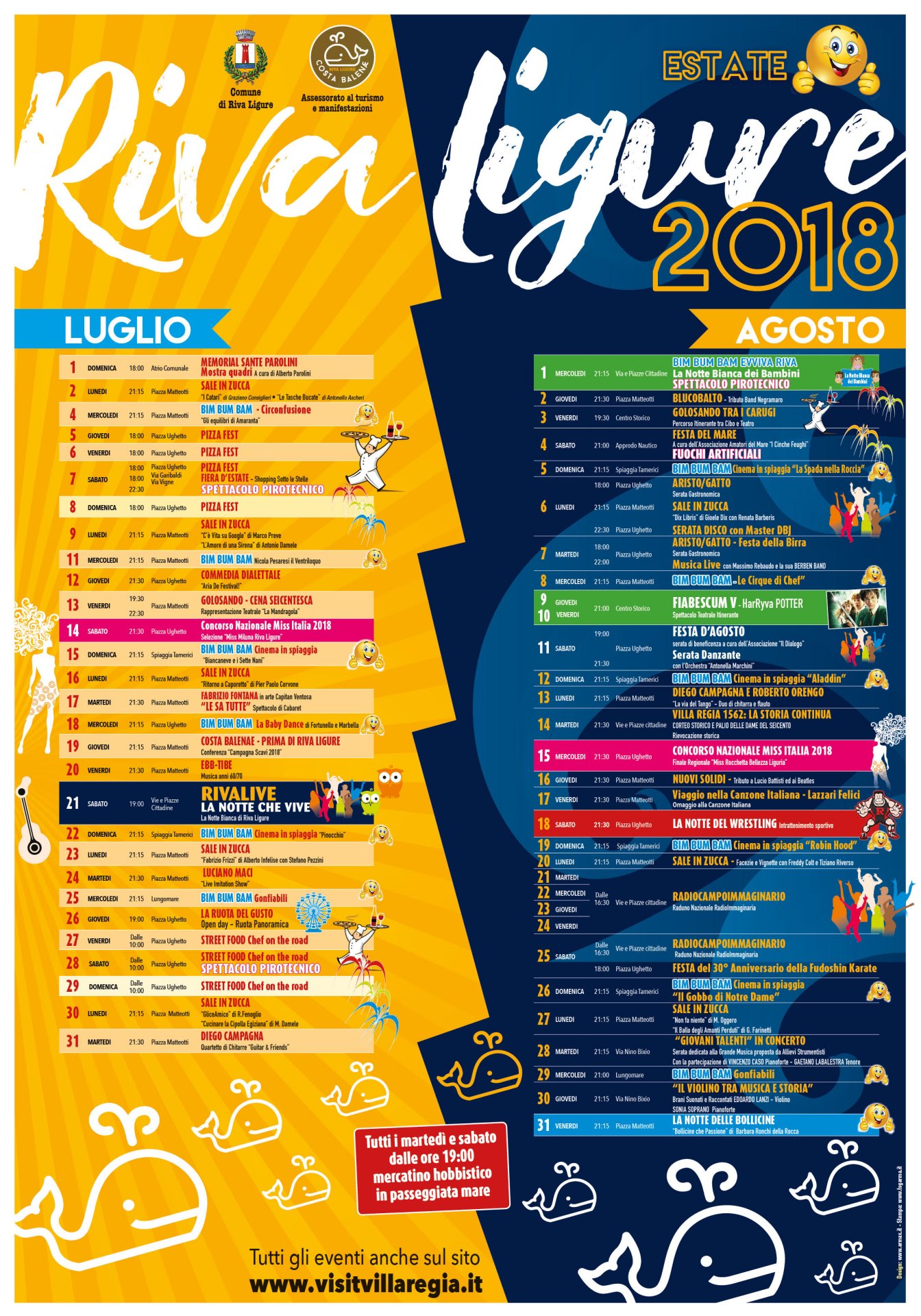 Tra gli altri diversi appuntamenti meritano una menzione speciale momenti particolarmente affascinanti, più precisamente, “Fiabescum 5, HarRyva Potter”, spettacolo di teatro itinerante, in esclusiva per il Comune di Riva Ligure, in programma il 9 e il 10 agosto a cura della compagnia del Marchingegno. Ancora, gli eventi musicali proposti dal Maestro Diego Campagna, che si svolgeranno il 31 luglio ed il 13 agosto