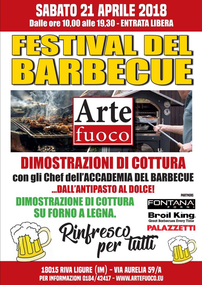Arte Fuoco presenta a Riva Ligure il Festival del Barbecue in scena sabato 21 aprile dalle 10:00 alle 19:30. L’evento, presso la sede di via Aurelia 59/A, nei pressi dello svincolo per Castellaro, è caratterizzato da un rinfresco e dalle dimostrazioni di cottura su forno a legna e su barbecue con gli Chef dell’Accademia del Barbecue: dall’antipasto al dolce. Partners dell’iniziativa i rivenditori Fontana Forni, Broil King e Palazzetti.