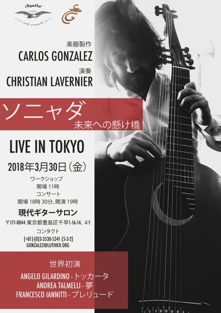Tre opere scritte da grandi autori del panorama contemporaneo (Angelo Gilardino, Andrea Talmelli, Francesco Iannitti) saranno presentate come prime esecuzioni mondiali a Tokio. Completeranno il repertorio le composizioni dello stesso Lavernier, anch’esse inedite, create appositamente per chitarra ad undici corde. Un progetto innovativo che da oltre un anno sta rivoluzionando il repertorio contemporaneo, attraverso uno strumento dalle caratteristiche tecniche ed espressive assolutamente uniche, creato dal liutaio Carlos Gonzalez per Christian Lavernier.