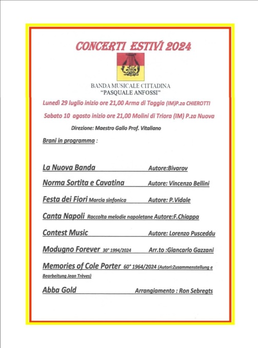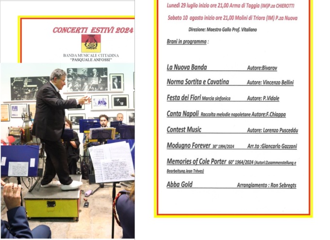 Proseguono i concerti estivi 2024 della Banda Anfossi di Taggia, diretta dal maestro Vitaliano Gallo. Il 29 luglio, alle 21, si esibirà in piazzale Chierotti ad Arma di Taggia e il 10 agosto, alla stessa ora, in piazza Nuova a Molini di Triora. In programma musiche (e rispettivi anniversari – commemorazioni) di: Bivarof, Bellini, Vidale, Chiappa, Pusceddu, Modugno, Porter, Abba.