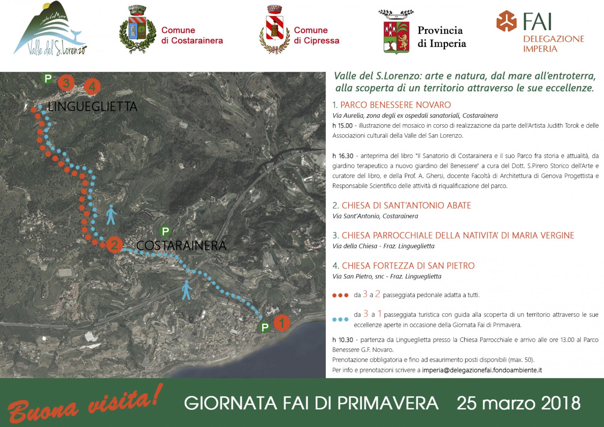 “Quest’anno la scelta della Giornata FAI di Primavera vuole porre l’accento sulla valorizzazione di un intero sistema territoriale, la Valle del S. Lorenzo” spiega la Capodelegazione FAI di Imperia, Carmen Lanteri. “La sua storia verrà raccontata attraverso alcune sue eccellenze culturali e naturalistiche. Il Parco Benessere Novaro e la Chiesa di Sant’Antonio Abate a Costarainera, la Chiesa della Natività di Maria Vergine e la Chiesa Fortezza di S. Pietro a Lingueglietta”.