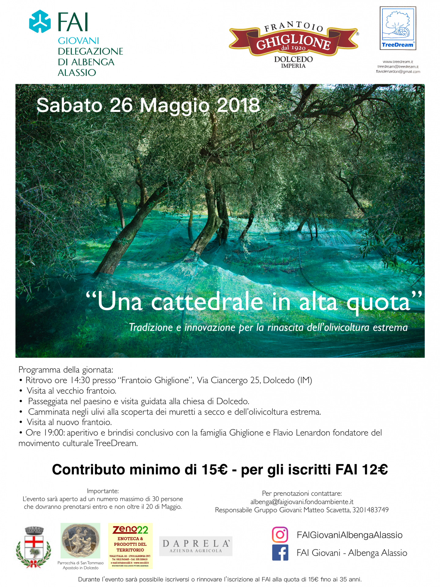 Il Gruppo FAI Giovani della Delegazione Albenga-Alassio in collaborazione con il Frantoio Ghiglione e con l’associazione TreeDream organizzano l’evento Una Cattedrale in alta quota. Tradizione e innovazione per la rinascita dell’olivicoltura estrema.