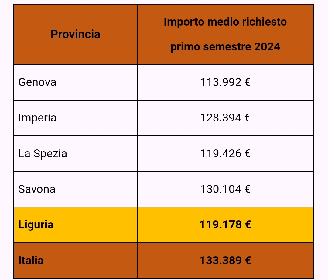 Guardando ai dati delle richieste a livello provinciale emerge che l’area dove è stato rilevato l’importo medio più alto è Savona (130.104 euro), seguita da quella di Imperia (128.394 euro); sul gradino più basso del podio troviamo La Spezia, con 119.426 euro. Chiude la graduatoria regionale la provincia di Genova, dove la cifra media richiesta è stata pari a 113.992 euro.