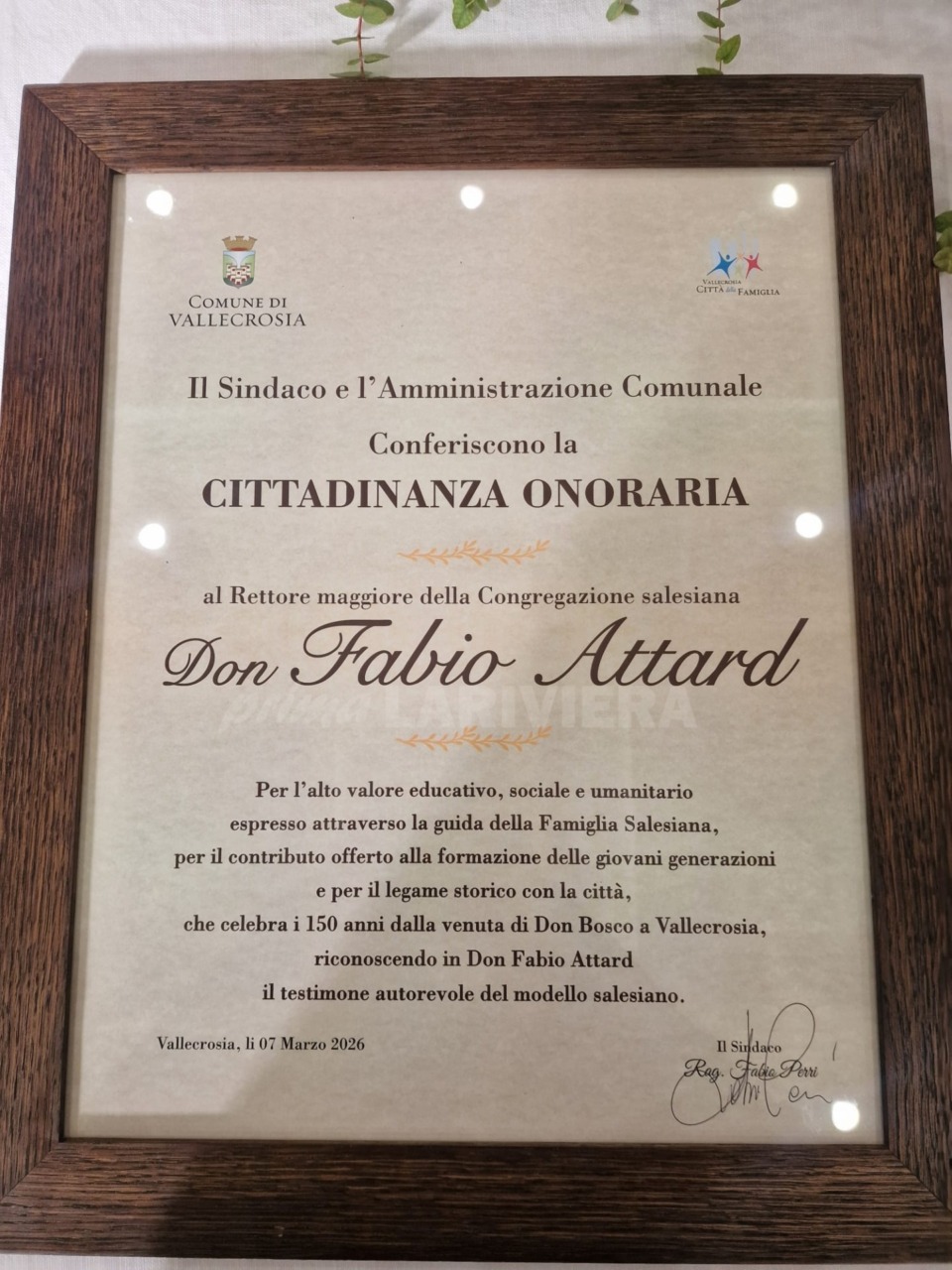 Il Consiglio comunale di Vallecrosia si è riunito in sessione straordinaria, alle 15, nella chiesa di Maria Ausiliatrice per conferire la cittadinanza onoraria al rettore maggiore dei Salesiani, don Fabio Attard, undicesimo successore di Don Giovanni Bosco.