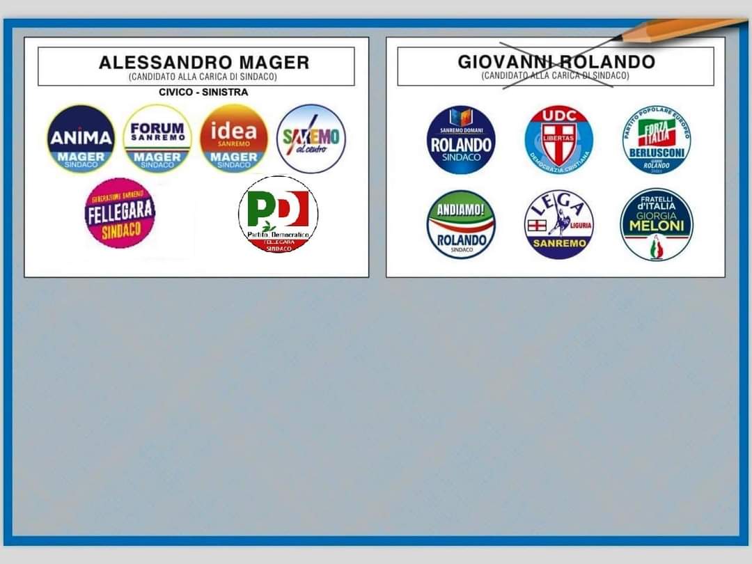Un fac-simile della scheda elettorale al ballottaggio che rappresenta le liste di Alessandro Mager come fosse avvenuto un apparentamento ufficiale con il centro sinistra, di Fulvio Fellegara quindi Anima, Sanremo al Centro, Idea e Forum affiancate da Generazione Sanremo e Partito Democratico (Progetto Comune ha annunciato che non avrebbe votato al ballottaggio).