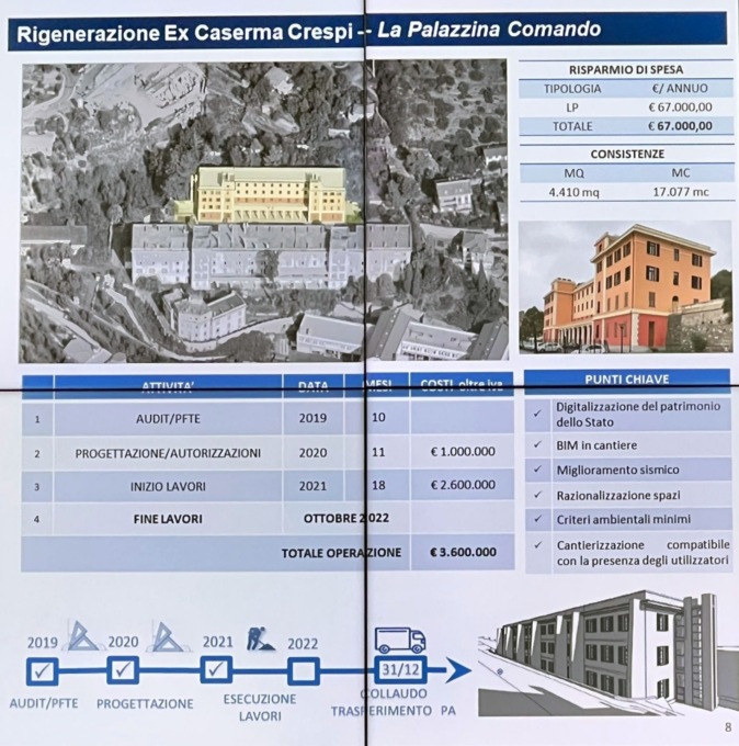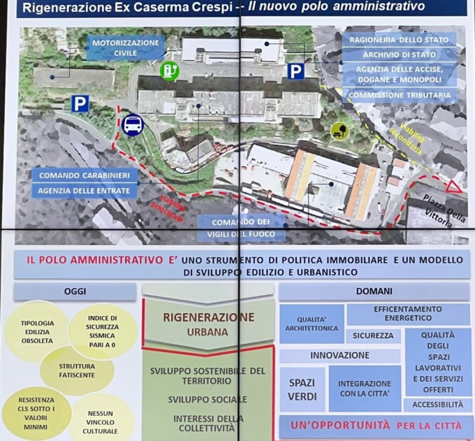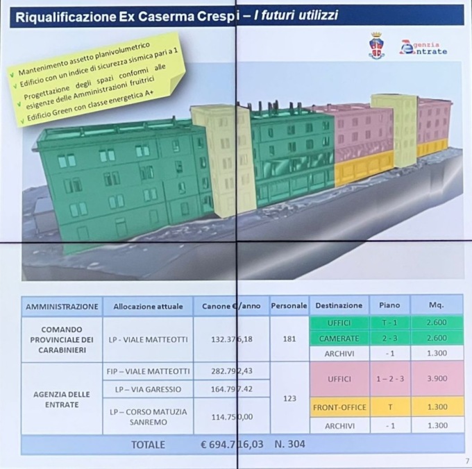 “Dalla progettazione, alla gara, alla realizzazione, l’obiettivo è rispettare quelli che sono gli attuali protocollo green, quindi avere un edificio non solo pienamente a norma, rispettoso delle esigenze delle pubbliche amministrazioni, ma anche sostenibile: molto attento alla sicurezza sui luoghi di lavoro, al risparmio energetico, all’efficientamento energetico e soprattutto alla vulnerabilità sismica”. Quello di Imperia è, al momento, un unicum in Liguria: “La Caserma Crespi nel 2026 sarà quello che si potrà definire un polo amministrativo, quindi in un unico compendio avremo una concentrazione di circa otto pubbliche amministrazioni – ha detto l’ingegnere -. Abbiamo esempi analoghi in Italia, ma non in Liguria. In regione abbiamo altri finanziamenti importanti su Genova e Sanremo ma non di questa portata come concentramento di pubblica amministrazione”.