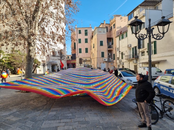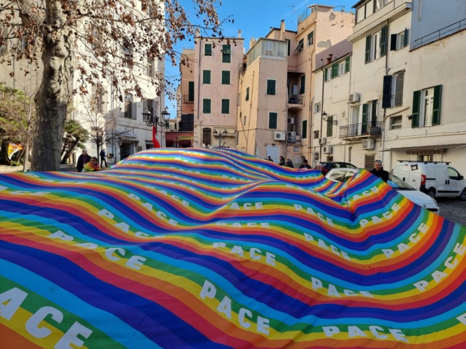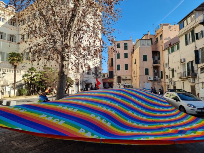 “No Zelensky al Festival”: Rifondazione srotola 30 metri di bandiera arcobaleno