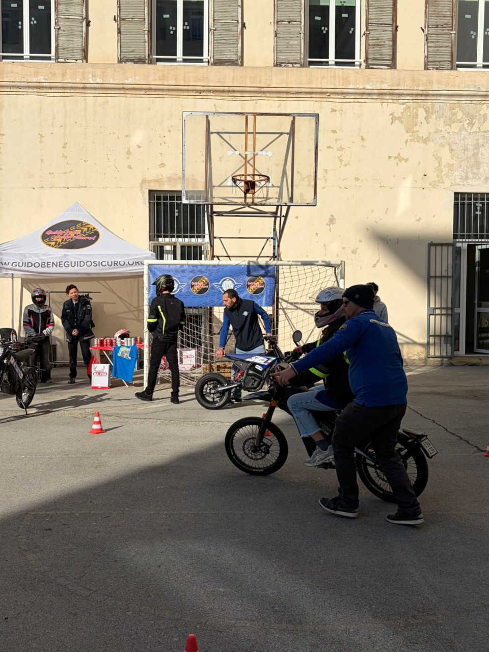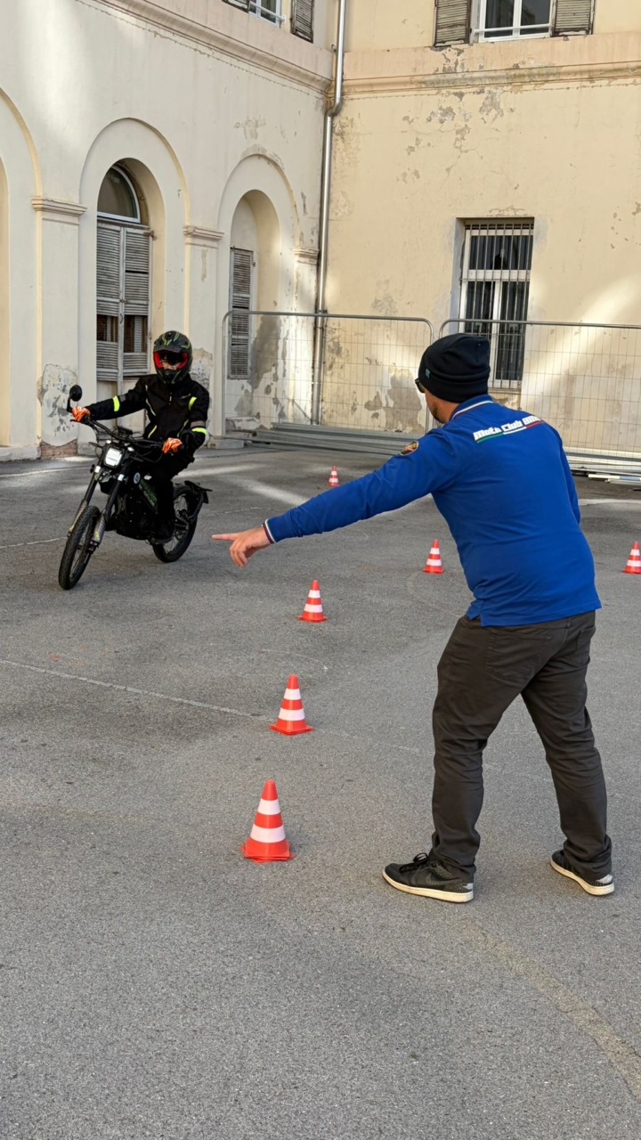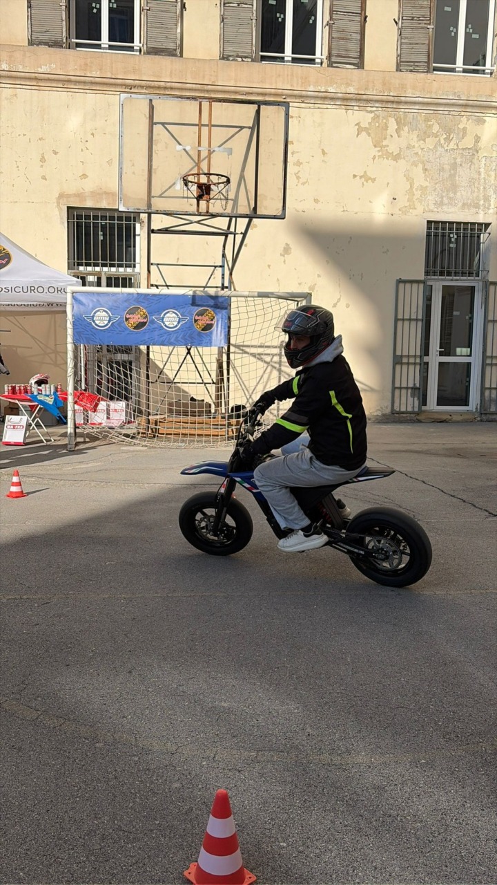 Il secondo incontro si è svolto nel piazzale della scuola, trasformato per l’occasione in un circuito e riservato ad uso esclusivo: con moto elettriche, giubbotti con protezioni, guanti e caschi, i ragazzi hanno sperimentato quanto illustrato dai tecnici, imparando le corrette modalità di guida attraverso slalom tra birilli e percorsi guidati.