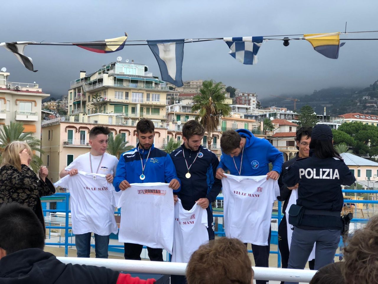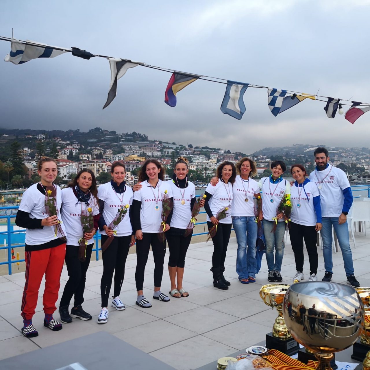 Tra i termini tecnici remieri il cosiddetto “VIA LE MANI” rappresenta un passaggio fondale della remata, il momento in cui le pale escono dall’acqua pulite e veloci si librano nell’aria; nell’ottica dell’Evento “VIA LE MANI” diventa un simbolo: via veloci verso la vittoria contro la violenza di cui molte donne sono state e sono vittime. A premiare con una rosa ad ogni partecipante donna e con magliette dedicate ai componenti degli equipaggi che si sono sfidati nelle acque sanremesi, oltre alla presidente Papetti, anche Adriana Di Biase, Vice Dirigente del Commissariato di Sanremo, che ha illustrato brevemente l’operato delle forze dell’ordine nell’ambito della violenza di genere, la socia fondatrice di Zonta Sanremo Lupetta Tessitore e l’ideatrice dell’evento Micaela Porcellana.