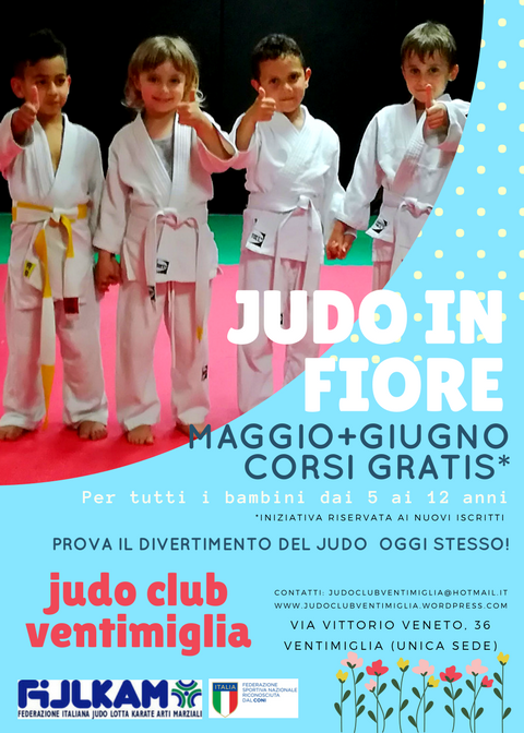 Il Judo Club Ventimiglia festeggia la primavera offrendo a tutti i bambini dai 5 ai 12 anni i corsi di judo nei mesi di maggio e giugno. I nati dal 2006 al 2013 potranno quindi frequentare gratuitamente la scuola nei due mesi.