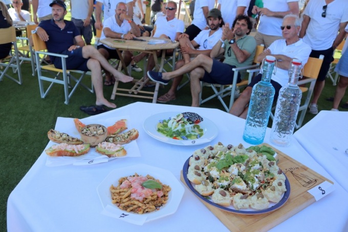 Dopo la mancata regata di venerdì 30 maggio, causa assenza di vento, in banchina si è svolta la tredicesima edizione della sfida culinaria Vela & Sapori, alla quale hanno aderito 10 equipaggi. Il presidente dello Yacht Club Sanremo Beppe Zaoli ha commentato: “Crediamo nella pesca locale, ma anche nei nostri monti e campagne. Ecco perché il tema di quest’anno era ‘Il Mediterraneo incontra le Alpi Marittime’ “. La giuria gastronomica, presieduta da Claudio Porchia, presidente dell’Associazione Ristoranti della Tavolozza di Sanremo, era composta da Daniela Borghi de “La Stampa”, dalla food blogger Raffaella Fenoglio e dal giornalista enogastronomico Beppe Dosio. Dopo avere giudicato l’originalità e fantasia, presentazione, difficoltà e sapore, la vittoria è andata al piatto preparato a bordo di Oliria, un Sangermani del 1976, intitolato “Scirocco per la Sicilia e Maestrale per la Liguria”. È seguito uno show cooking realizzato in collaborazione con i ristoranti sanremesi Osteria del Marinaio e Paolo & Barbara, quest’ultimo una stella Michelin conquistata nel 1990. Tra i piatti degustati il gambero rosso di Sanremo flambato al whisky con fiore di trombetta in pastella e il gambero marinato al passion fruit.