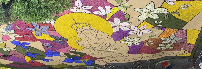 Nives Bonavera ci racconta i dettagli della composizione floreale: “Il Corpus Domini 2023 nell’Infiorata di quest’anno si fa preghiera alla Madonna del Carmine come madre dell’Eucarestia. Si inizia con il volo di una colomba bianca che si innalza verso la raggiera centrale, dove l’ostia, il corpo di Cristo, contiene la croce del suo Sacrificio.