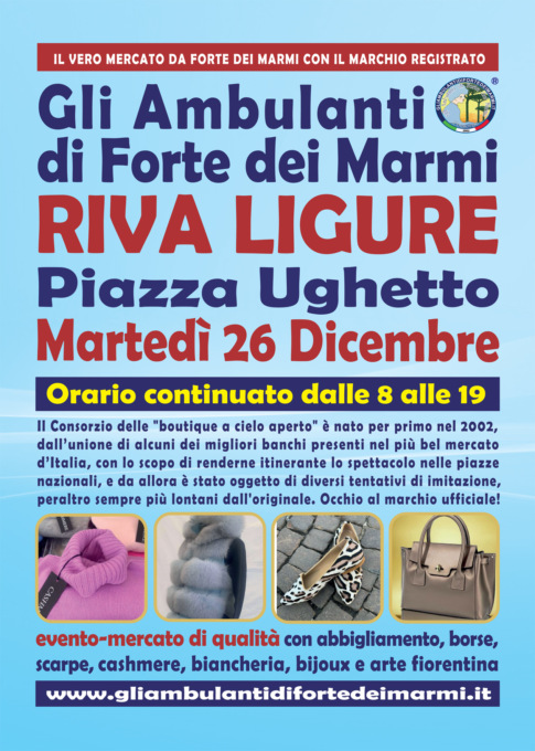 È sempre tempo di festa, di regali e di shopping, e Gli Ambulanti di Forte dei Marmi, le bancarelle del mercato di qualità più famoso d’Italia, tornano a grande richiesta anche nella Riviera di Ponente, con il loro show all’insegna del meglio del Made in Italy artigianale e delle ultime tendenze della moda. Si potranno ammirare le ormai mitiche “boutique a cielo aperto” dell’originale Consorzio il giorno di Santo Stefano, martedì 26 dicembre, a RIVA LIGURE, nella consueta location di Piazza Ughetto e Via Martiri della Libertà. Dunque, un appuntamento da non perdere assolutamente per i tanti appassionati del genere, come sempre all’insegna dello shopping più glamour e conveniente, con orario continuato, anche in caso di maltempo, dalle 8 alle 19.