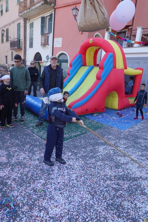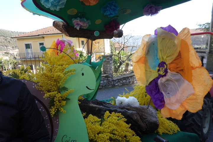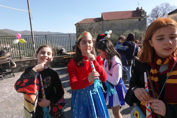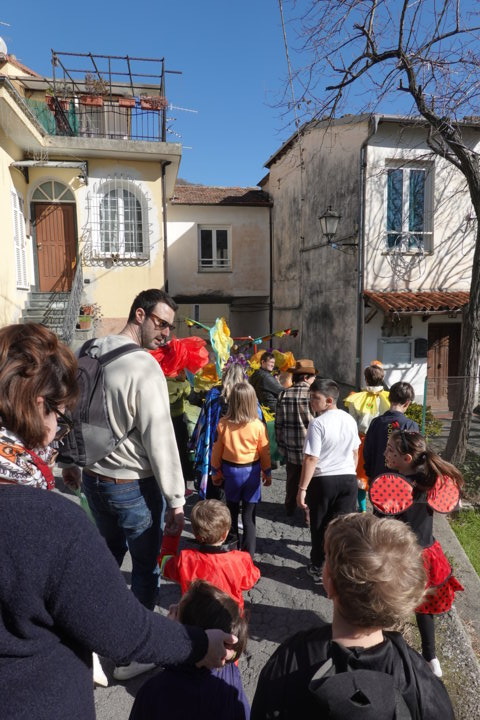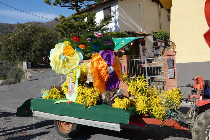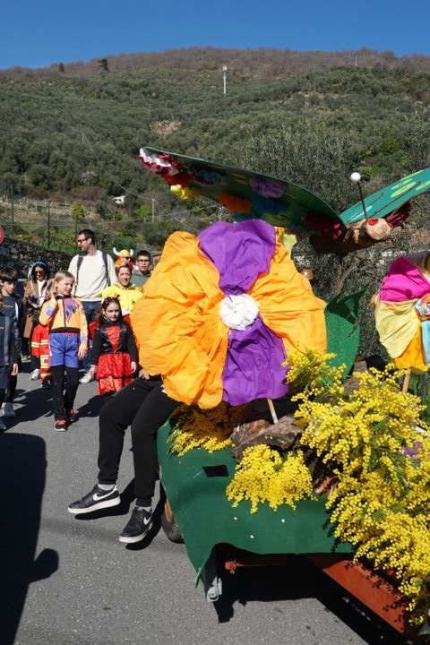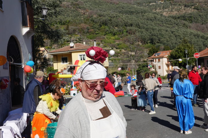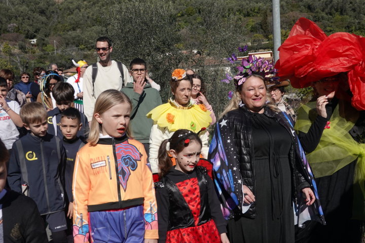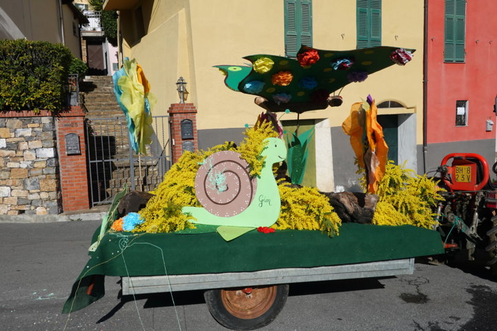 Si parte alle 11 dalla parte alta del paese, Borgo Barnati, davanti alla cappella di San Bartolomeo. Ad accogliere tutti, il bel carro fiorito del paese, trainato da un trattore, perfetto nell’ambiente rurale. La composizione prevede tronchi d’olivo, fiori, figure ritagliate, a riprodurre un racconto, con le lumache protagoniste. Manco a dirlo, nel paese della sagra delle lumache. Una esplosione di colori, una vera e propria installazione artistica che viene seguita da un folto gruppo di maschere fino alla piazza Viani, in t’u Ciàn. Qui si è accolti dalla musica di dj Mesci, che non cesserà un attimo la sua vivace animazione. Giochi gonfiabili e corse a perdifiato per tutti i bambini e ragazzini, maschere bellissime e…parecchi più avanti negli anni che ridiventano bambini. Si passa al pranzo, davvero stuzzicante e si continua imperterriti…è la volta delle pentolacce. Lì si sono sempre misurate le capacità di forza dei bambini, pensando magari ai tempi in cui si abbacchiavano le olive con la tràppa, il comune bastone e non con le diavolerie moderne, elettriche, ma sicuramente performanti. C’è sapore di un divertimento antico e semplice nella zuffa a terra per le caramelle cadute dai sacchi, in mezzo a una nuvola di coriandoli. Verso le 15, quando la piazza accoglie l’ombra delle alte case che le fanno corona, ecco il thé caldo e i biscotti fragranti, con un aroma di limone che rimanda ai profumi dell’agrumeto più vicino. Una giornata che è stata anticipo di primavera, organizzata come sempre della locale Pro Loco, supportata dal patrocinio del Comune di Pontedassio. Ancora una volta la formula di un divertimento semplice, allegro, colorato, ha fatto dire a molti bambini che “è stata una giornata bellissima!”.
