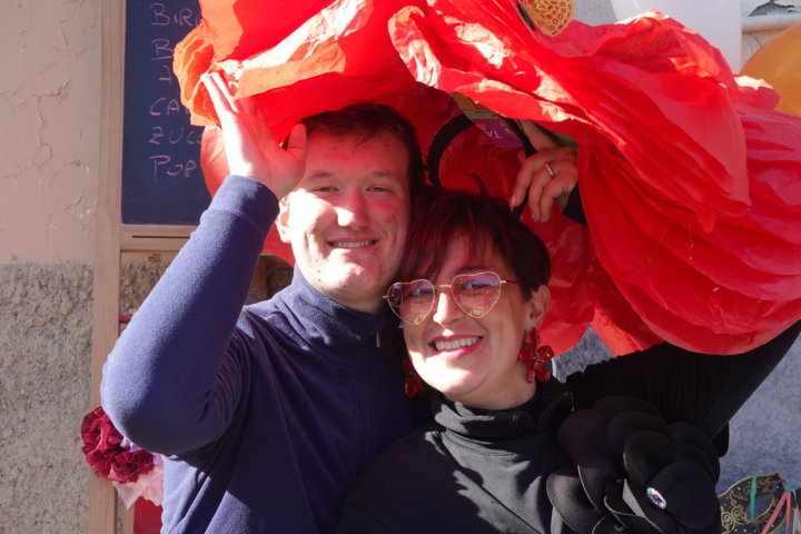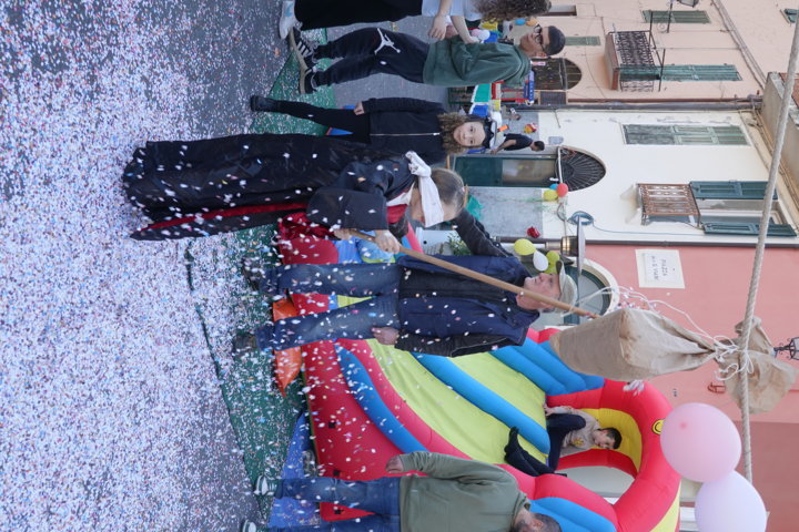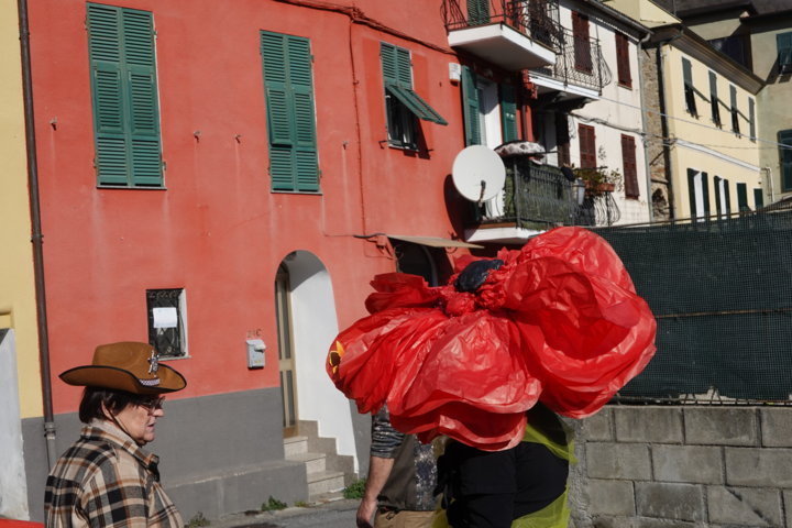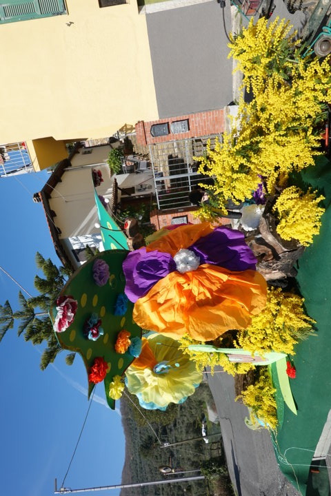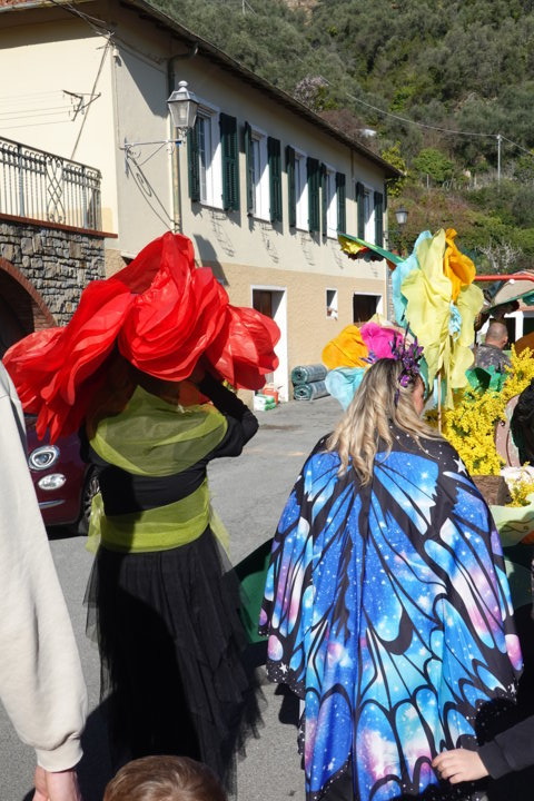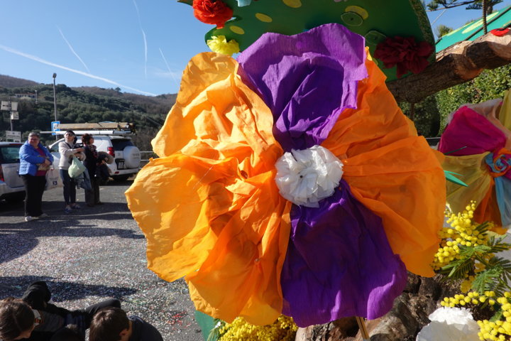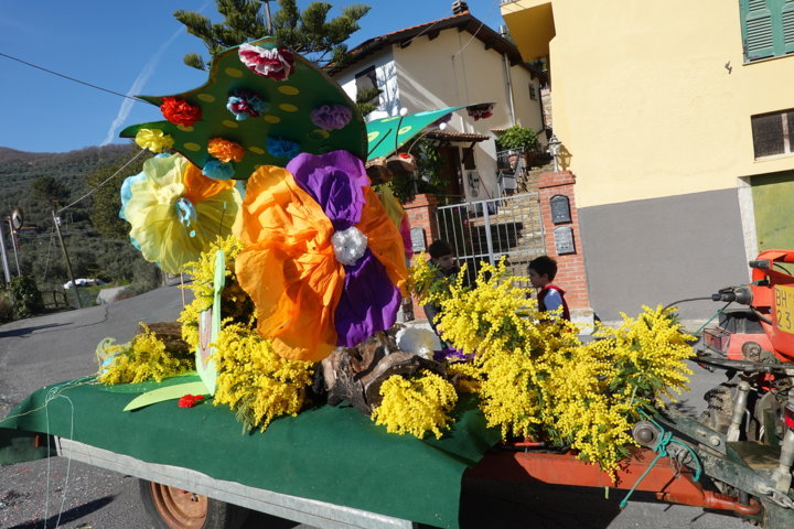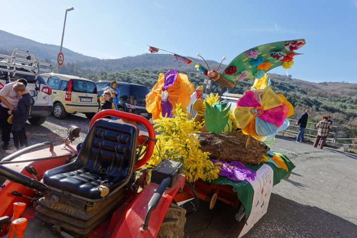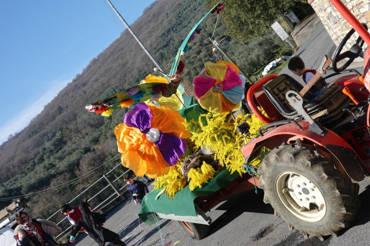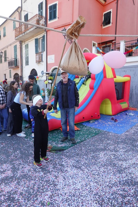 Si parte alle 11 dalla parte alta del paese, Borgo Barnati, davanti alla cappella di San Bartolomeo. Ad accogliere tutti, il bel carro fiorito del paese, trainato da un trattore, perfetto nell’ambiente rurale. La composizione prevede tronchi d’olivo, fiori, figure ritagliate, a riprodurre un racconto, con le lumache protagoniste. Manco a dirlo, nel paese della sagra delle lumache. Una esplosione di colori, una vera e propria installazione artistica che viene seguita da un folto gruppo di maschere fino alla piazza Viani, in t’u Ciàn. Qui si è accolti dalla musica di dj Mesci, che non cesserà un attimo la sua vivace animazione. Giochi gonfiabili e corse a perdifiato per tutti i bambini e ragazzini, maschere bellissime e…parecchi più avanti negli anni che ridiventano bambini. Si passa al pranzo, davvero stuzzicante e si continua imperterriti…è la volta delle pentolacce. Lì si sono sempre misurate le capacità di forza dei bambini, pensando magari ai tempi in cui si abbacchiavano le olive con la tràppa, il comune bastone e non con le diavolerie moderne, elettriche, ma sicuramente performanti. C’è sapore di un divertimento antico e semplice nella zuffa a terra per le caramelle cadute dai sacchi, in mezzo a una nuvola di coriandoli. Verso le 15, quando la piazza accoglie l’ombra delle alte case che le fanno corona, ecco il thé caldo e i biscotti fragranti, con un aroma di limone che rimanda ai profumi dell’agrumeto più vicino. Una giornata che è stata anticipo di primavera, organizzata come sempre della locale Pro Loco, supportata dal patrocinio del Comune di Pontedassio. Ancora una volta la formula di un divertimento semplice, allegro, colorato, ha fatto dire a molti bambini che “è stata una giornata bellissima!”.