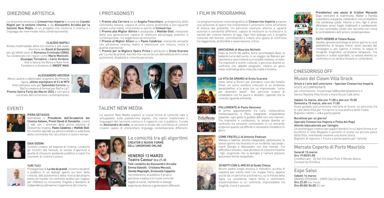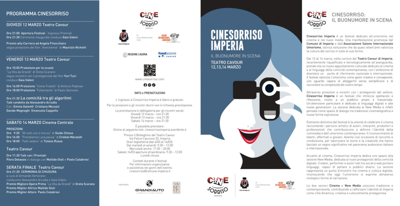 Si terrà a Imperia, presso il Teatro Cavour, dal 12 al 14 marzo 2026 la prima edizione di Cinesorriso Imperia, festival cinematografico che mette al centro la commedia e l’umorismo come strumenti di racconto del nostro tempo, tra cinema, nuovi linguaggi e media contemporanei con la direzione artistica della sezione Cinema di Claudio Napoli, e la sezione New Media diretta da Alessandro Arcodia, per un progetto che mette in dialogo il cinema e i nuovi linguaggi. Il festival celebra la commedia attraverso il riconoscimento di alcuni protagonisti significativi del panorama italiano contemporaneo, interpreti e autori capaci di rappresentare, con linguaggi diversi, l’evoluzione del genere.