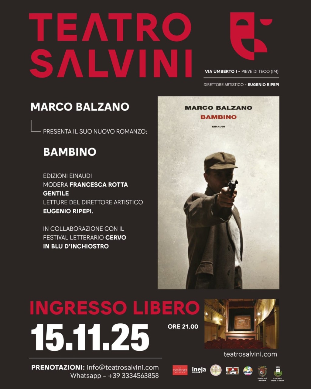 Sabato 15 novembre alle 21, nella serata in collaborazione con Cervo InBlu, Marco Balzano presenta il nuovo romanzo “Bambino”, edizioni Einaudi, grazie a Francesca Rotta Gentile che modererà, con letture del Direttore Artistico Eugenio Ripepi. E il giorno dopo, domenica 16 alle 15, in collaborazione con l’associazione Imperia Musicale, andrà in scena Salvini Unplugged, con la musica originale di tre apprezzati cantautori: Chiara Ragnini, Francesca Pilade e Stona. Il cartellone del Teatro Salvini è diretto da Eugenio Ripepi e organizzato con il Comitato San Giovanni e Tradizioni Onegliesi, con il supporto del Comitato Madonna dei Fanghi di Pieve di Teco e la collaborazione di CLAP Aps, con il sostegno del Comune di Pieve di Teco e il patrocinio dalla Provincia di Imperia.
